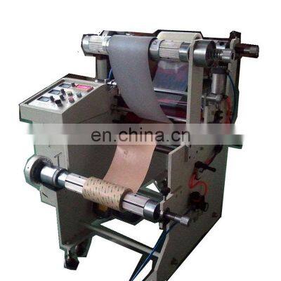 Silver foil 3M adhesive tape protective film laminating machine Descriptions :1.Magnetic powder control the unwind and rewind tension.2.Frequency conversion is used for speed regulation of the main motor.3.The cylinder control the rubber roller up and down.4.Automatic meter counting,stable laminating,fast,high precision,low wastage,and easy operation.5.Optional:1.Photoelectric tracking system to keep the unwind material in line.2.Slitting function.3.Hot laminating function.4.can make as your requirements. Application :Used for laminating industrial tape, electronic material, protective film, copper foil, aluminum foil, OPP, PP, PE, PVC, paper, cloth.etc. Main technical data:ModelDP-650Max Feeding Width ( mm)650Unwinding Diameter ( mm )400Rewinding Diameter(mm)450Precision±0.3mmTotal power1.5kwInner Paper Core Diameter 3 inchVoltage220V 50HZ Configuration:Unwinding shaft : 3 inch inflatable shaft 3 pcsRewinding shaft : 3 inch inflatable shaft 1 pcsMagnetic brakes : 3 set Magnetic clutch : 1 set Laminating motor: 1set Laminating roller : 2 (PU material)Air cylinder : 2 pcs