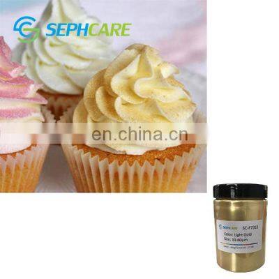Product DescriptionSephcare Cake Food Coloring Pearl gold powder 24k Candy Metallic Edible Luster Dust Glitter for Cake Beverage DecorationSephcare's food grade pearl pigment is make up of natural mica flakes, titanium dioxide and iron oxide. The pearlescent pigments are specially made to meet the food and pharmaceutical industries' high quality requirements. all kinds of luster is coated with iron oxides, and the iron oxide can increase the color absorption rate. And this is how we keep our gold luster so shinny.In order to obtain all kinds of luster effects, what we did, is to maintain a certain amount of thickness of the iron oxides.Item NameEdible luster dust food additivesColor Multi colorAppearanceFine powderPH6-11Density2.50-3.40 kg/LParticle size10-60 µmSolubility (in water)InsolublePaymentTT/Weatern Union/PayPalShippingFedex, By Air, By Sea.Detailed ImagesOur CompanyOur ServiceTo support all the demanding customers, we are going to focus on value addition in order to satisfy the needs of all our customers. The valued-added service spans:1.Special Packings 2.Own Brand Labeled 3.Product Images Support 4.Formulation Guideline Support,etcPacking & DeliveryAll freights are determined based on the weight of the item and the destination. 1.1kg with double plastic container inside/Aluminum foil bag outside. 25kg with double plastic container inside/Fiber drum outside or it is at your option.2.Dispatch goods Usually via DHL and FEDEX, but other kind of shipping ways can be negotiated.3.Delivery Time: 7 days after payment.FAQQ1: How can I place order?A: You can send inquiry to us or start a chat online with me first.Q2: Do you provide samples?A: Yes. Sample pack can be send to you, please tell us your usages, also need your shipping address and post code.Q3:How can I pay for you?A: We accept Online bank payment,T/T and Western Union and Trade Assurance. Before you pay, please contact us for payment details.Q4: Can you do OEM for me?A: Yes, we are good at OEM order, just provide us what you want and we can give the best design.