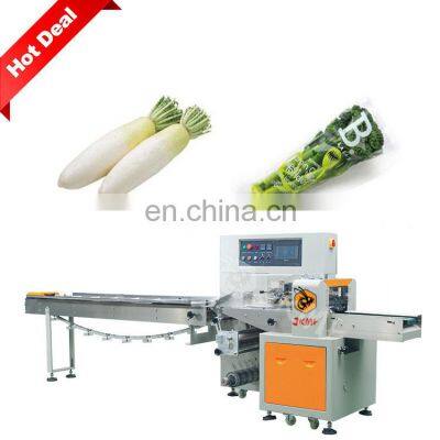 Hot Sales Full Servo Radish Carrot Pillow Packaging MachineProducts DescriptionMachine ApplicationAutomatic flow packing machine is a widely used packing machine. Suitable for all kinds of product packaging. Including medical supplies, vegetables and meat, baked bread, snacks and candy, daily necessities, hardware accessories, etc.If you need other bag types, we can provide the machine you need, please click to contact me. Machine InformationModelJK-250XJK-350XJK-450XJK-600XJK-700XFilm WidthMax.250 mmMax.350 mmMax.450 mmMax.600 mmMax.700 mmBag Length45~330 mm65~330 mm120~450 mm130~450 mm120~600 mmBag Width30~110 mm50~160 mm60~210 mm60~280 mm50~330 mmProduct HeightMAX. 70 mmMAX. 80 mmMAX. 110 mmMAX. 110 mmMAX. 150 mmPacking Speed40~230 bags/min40~230 bags/min30~150 bags/min30~180 bags/min20~120 bags/minPowder220V,50/60Hz,2.4KWMain Features1.Dual frequency conversion control, Bag length can be set and cut in one step, saving time and film.2.Interface features easy and quick setting and operation.3.Self failure diagnosis, clear failure display.4.High sensitivity photoelectric eye color tracing, numerical input of cutting sealing position for extra accuracy.5.Temperature independent PID control, more suitable for packaging different materials.6.Positioned stop function, without sticking knife or wasting film.7.Simple driving system, reliable working, convenient maintenance.8.All control is realized through software, easy for function adjusting and technical upgrade.Optional DevicesDepending on your needs, you can choose to add the following configuration. For example date printer, linking bag device, gas-filled device, easy tearing device and hole device.Machine Working Process1st step: Put the packaging film on the holder and wear the film as required.2nd step: Setting the parameters you want by touch screen.3rd step:Put the materials to be packed on the conveyor belt4th step: The bag former will make the bag automatically.5th step: The horizontal and vertical cutter device will seal the middleand of the bag.6th step: You will get the nicely paper or plastic bag type.Why Choose UsJIKE BEE MACHINERY has a professional team to provide customers with various packaging solutions. Fully understanding the needs of customers,engineers design the most suitable solution. We have our own processing and assembly workshop and quality inspection and debugging process to ensure the quality of the machine. After acceptance by the customer, they are packed in international standard wooden cases and shipped.Company ProfileFoshan Jike Bee Automation Equipment Co., Ltd. is a manufacturer of automatic packaging equipment.We are a production-oriented enterprises focused on product innovation, factory direct sales and perfect after-sales service in one.The automatic packaging equipment for granule, powder, liquid and sauce produced by the Jason company is at the advanced level of the industry,it can be customized production automatic material packaging line for all kinds of products .Mainly applicable to: food, hardware, drugs, daily chemicals, pesticides, fruits and vegetables, cosmetics, other industries.The company has its own patent and product technical certification, which can bring customers high quality equipment and worthy of customer trust.Customer PhotosOur customers have covered more than 80 countries around the world.And give us unanimous praise.CertificationsFAQQ1:Do you have manual or operation video for us to know more about the machine? Yes, not only manual or operation video, 3D drawing also available to make as per your design,also the video we can make of testing the material from our packaging machine if your packing goods easier for us to find from our local market. Q2:How can I trust you for the first time business ?Please note our above business license and certificate. And if you don't trust us, then we can use Alibaba trade assurance service, guarantee your money, and guarantee your machine's on-time delivery and machine quality.Q3:Is engineer available to serve oversea?Yes, but the travel fee is paid by you. So actually to save your cost, we will send you a video of full details machine installation and assist you till the end.Q4:How can we make sure about the machine quality after we put the order?Before delivery, we will send you the pictures and videos for you to check the quality, and also you can arrange for quality checking by yourself or by your contacts in China.Q5:Will you provides the door to door service?Yes. Please offer us your final destination, we will check with our agent to see if it available, and most of the area is ok for us to clearing and sending in your countries.