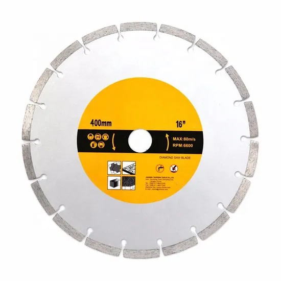 16 inch cold pressed Diamond saw blade discs diamantado for cutting concrete brick marbleProduct DescriptionBlade Length: 16inFinishing: WhiteSize: 400mmPlace of Origin: Jiangsu, ChinaWarranty: 3 MONTHSBlade Thickness: 0.042inArbor Size: 1inTeeth per Inch: 10Teeths: 140Blade Diameter: 16inEdge Height: 0.472in(12mm)Process Type: Cold PRESSCustomized support: OEMGrade: IndustrialApplication: Concrete CuttingAdvantage: Cost-effectiveMaterial: 65Mn+DiamondPackage: Carton BoxCertification: ISO9001 /MPASurface Treatment: Varnish PaintingQuality Grade: Professional GradeTeeth type: SegmentedMachine: Concrete Cutting Machine