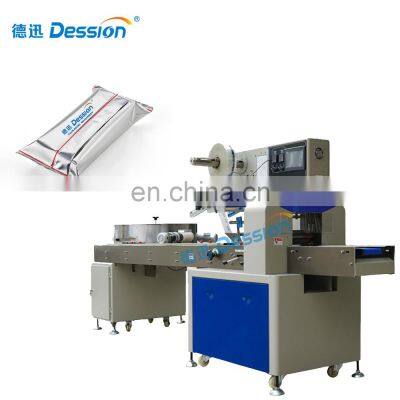 Automatic Servo Control High Speed Hard Candy Flow Packing Machine Sweet Candy Bar Horizontal Packaging MachineMachine IntroductionPackaging ApplicationAutomatic flow packing machine is a widely used packing machine. Suitable for all kinds of product packaging. Including medicalsupplies, vegetables and meat, baked bread, snacks and candy, daily necessities, hardware accessories, etc.Packing EffectThe effect after packaging is back-seal bag. According to demand, other devices can be customized or upgraded to meet other models. For example, pillow bag with hole, bag with label, gusset bag, etc.Machine Structure and ParametersMachine Characteristics1. Double frequency conversion control, the bag length canbe set and cut, no need to adjust the air, one step in place, saving time and film.2. Man-machine interface, parameter setting is convenient and quick.3. Fault self-recognize function, fault display at a glance.4. High-sensitivity photoelectric eye color tracking, digital input sealing position, make sealing position more accurate.5. Temperature independent PID control, better suitable for various packaging materials.6. Positioning stop function, no sticky kuife, no waste film.7. The transmission system is simple, the work is more reliable, and maintenance is more convenient.8. All control is implemented by software, which is convenient for function adjustment and technical upgrade, and never lags behind.ModelDS-250BDS-320BDS-350BDS-400BDS-450DDS-600DFilm Width(mm)Max.250Max.320Max.350Max.400Max.450Max.600Bag Length(mm)65~280130~320120~450130~450Bag width(mm)30~11050~15050~16050~19060~21060~280Products Height(mm)Max.40Max.45Max.110Packing Speed(bag/min)40~23030~18030~150Machine Power220V / 380V, 50/60HZ,2.4KWMachine Size(L*W*H, mm)3770*670*14503770*720*14503770*720*14504020*770*14503990*900*14683990*1000*1468Machine Weight800KG900KG1050KGDetails ImagesMachine WorkflowThis machine is easy to operate. Just set the parameters on the screen, and then you can start the machine. Put the product on the conveyor belt, the machine will automatically pull the film, the bag is formed, sealed, and finally the bag is cut.High-speed sorting turntableCustomize production according to material size, which can make materials quickly and automatically feeding on conveyor.Multilingual touch screenThe machine supports various language customization, easy to operate.High sensitivity eye sensorThe eye sensor automatically senses the color code to ensure accurate and beautiful packaging effects.Replaceable bag formerWhen you want to change the bag width, you only need to change a different size bag fromer.Electronic control componentUse Panasonic PLC and frequency converter to ensure the stable operation of the machine.Why Choose Us1. Professional and Strong TeamDession has a professional team that can provide customers with various packaging solutions. After fully understanding the customer's needs, we provide the most suitable packaging solution to the customer. Then start the production of the machine. We have a strong production and processing capacity, from the customized processing of accessories to the assembly and debugging ofthe machine. Finally, it is packaged and shipped, and it only takes a week to complete.2. Excellent transportation serviceAccording to the needs of customers, we can provide sea transportation, air transportation, and land transportation services, so that you can get the machine as soon as possible. Provide door-to-door transportation services.3. Timely and effective after-sales serviceChoosing us is not only buying a machine, but also our professional and timely service. 1. When the machine is delivered, we will attach a video of the installation and operation of the machine, so that you can use the machine quickly. 2. All electrical appliances of our machines have a one-year warranty, and we will replace them if they fail. 3. When your machine fails, we will have professional engineers to provide professional online after-sales service to help you solve the problem. 4. If the problem cannot be solved online, we will arrange an engineer to repair it on site within a week.Buyer FeedbackWe have 8 years of experience in foreign trade and export, and now our customers have spread to 90 countries all over the world. With our high-quality machines and professional services, we have won unanimous praise from our customers.Company Profile Dession a leading manufacturer of Packaging machine and supporting facilities, which has successfully developed more than 80 kinds of packaging machines. Dession Packaging Machine has widely applied for different fields throughout the world, such as food/ industrial food, medicines, hotel supplies, disposable goods, rubber goods, daily appliances, hardware fittings, sporting goods, toys etc. Dession has more than 8000 square meters of production plants, 5 production workshops and a parts processing workshop, including small vertical machine production workshops, vertical machine production workshops, pillow machine production workshops, cartoning machine production workshop and filling machine production workshop.FAQQ1:Do you have manual or operation video for us to know more about the machine? Yes, not only manual or operation video, 3D drawing also available to make as per your design,also the video we can make of testing the material from our packaging machine if your packing goods easier for us to find from our local market. Q2:How can I trust you for the first time business ?Please note our above business license and certificate. And if you don't trust us, then we can use Alibaba trade assurance service, guarantee your money, and guarantee your machine's on-time delivery and machine quality.Q3:Is engineer available to serve oversea?Yes, but the travel fee is paid by you. So actually to save your cost, we will send you a video of full details machine installation and assist you till the end.Q4:How can we make sure about the machine quality after we pu