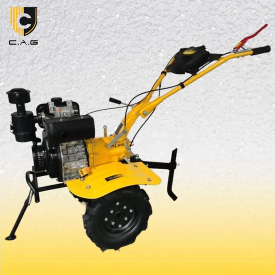 - This Tiller is equipped with a powerful CAG 7HP single-cylinder Diesel engine, which provides a great power-to-weight ratio. It has a recoil starter and a centrifugal friction clutch. The maximum rotating power is 3600 RPM and the maximum tine speed is 100 RPM, with a 30:1 reduction ratio.