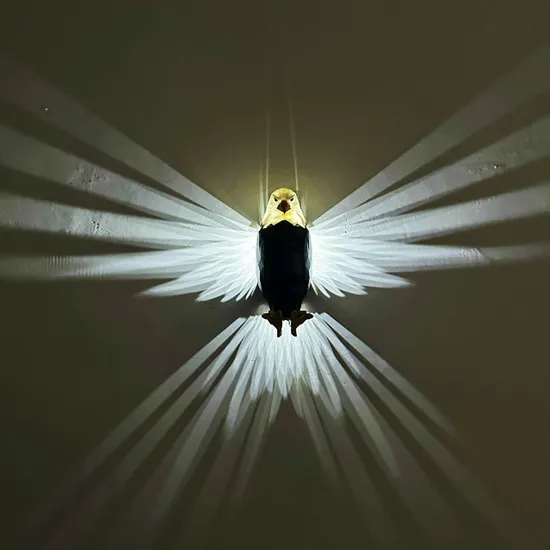 Product Description Lifelike Bald Eagle Wall Light: The eagle shadow lamp brings a touch of nature's elegance into your home, Its meticulously crafted eagle design appears to soar off the wall, creating an enchanting focal point. The eagle lamp's light filters outward, casting a luminous ambiance that enhances any space Effortless Magnetic Installation: Enjoy the convenience of our innovative magnetic base, making installation a breeze. Simply mount the eagle wall light on the wall in seconds, and when it's time to recharge, detach it effortlessly and connect it to the charger. No fuss, no hassle Remote Control and Timed Light Off: Take control of your lighting with the included remote control. Easily switch the eagle light on and off, and set a timer to automatically turn off the night light after your desired period, ranging from 1 to 4 hours. Enjoy the perfect lighting experience, tailored to your needs Versatile and Stylish: This bald eagle wall lamp seamlessly enhances any room's decor. Use it as a gentle night light in the bedroom, a striking centerpiece in the living room, or a unique addition to the office. Its multifunctional design adapts effortlessly to your needs, making it a versatile choice for any setting Perfect Gift for Any Occasion: Celebrate the spirit of America with this stunning bald eagle lamp. As a symbol of national pride and heritage, it serves as a reminder of the values of freedom and bravery. Whether for Veterans Day, Independence Day, Christmas, Halloween, Father's Day, or any other special occasion, this lamp is a thoughtful and memorable gift Detailed Photos