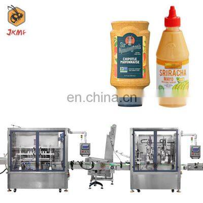 High Speed Automatic Sauce Squeeze Bottle Filling Machine Pizza Sauce Bottle Filling Machine Mayonnaise Sauce Filling MachineProducts DescriptionThe full automatic quantitative liquid filling line is designed for saving time on adjusting and testing machine,it can filling liquid or paste accurately by entering a certain filling volume.The PLC control method makes it easy to operate,the high speed working efficiency is ideal for medium or large scale production.It can work with the automatic capping machine and labeling machine to form a complete production line and realize high speed packaging work.Application:This machine is suitable for filling liquid and paste like juice,beverage,drinks,milk,makeup remover etc.It is widely used in drinks,cosmetics,daily chemical and pharmaceutical industries.Machine Features1.Touch screen operation interface. 2.Up and down movement type filling, effectively prevent the foam from being produced, easy to take apart and wash. 3.The filling accuracy can reach ±1%. 4.The filling cylinder is ground, unique filling valve design, no leakage. 5.With no bottle no filling and automatic bottle stop function. 6.Design different positioning devices according to the actual situation of the bottle; 7.The equipment is easy to clean, can be disassemble without tools, it can also be cleaned online or high temperature sterilization. 8.PLC programmable control use Japan Mitsubishi. 9.Frequency converter adopts France Schneider10.Pneumatic components adopt Taiwan Airtac. 11.Material contact parts are made of SUS304# stainless steel. 12.The equipment meets the hygiene and safety standards. The user can choose the glass protective cover.Liquid Filling MachinePackaging MaterialLiquid (Sauce/Paste)Packaging Range1-1000 mlNumber of Filling Heads2/4/6/8/10/12Filling SpeedMax.2800BPHFilling Accuracy±1%Machine Voltage Optional220/380V,50/60HzMachine Power3KWMachine Size (L*W*H)2000*900*1900mmMachine Weight400KGAutomatic Filling Machine The pneumatic filling nozzle can ensure filling paste faster,it is with anti-dripping design which ensure the machine and production cleanliness.The machine is equipped with high quality electric eye,can detect passing by container accurately and realize the automated work,reduce the production error and improve working eficiency.Bottle Capping MachineBottle Cap SystemLift bottle cap auto unloadingBottle Capping SystemAir gripper capCapping SpeedMax.2400BPHBottle and Cap SizeCustomizableMachine Voltage Optional220/380V,50/60HzMachine Size (L*W*H)2000*1560*1560mmMachine Weight400KGBottle Capping Machine The PLC control system is intelligently controlled and easy to operate. The adjustable cap chute is suitable for caps of different sizes, and the capping speed is up to 160 BPM. If the cover is missing, it will automatically shut down and give an alarm to reduce waste.Bottle Labeling MachineBottle SizeBottleφ:12-100mm; Bottle height:30-200mmLabel SizeH:15-100mm; L:20-300mmLabeling SpeedMax.3000BPHUse Air Source0.5-0.7 MPaMachine Voltage Optional220/380V, 50/60HzMachine Power1.2KWMachine Size (L*W*H)2000*900*1600mmMachine Weight200KGBottle Labeling Machine Automatic labeling machine for the whole high-garde stainless stell and high-garde aluminum alloy, labeling head using high-speed servo motor to ensure the accuracy and speed of labeling, PLC with man-machine interface contral, simple operation clear.Why Choose UsJIKE BEE MACHINERY has a professional team to provide customers with various packaging solutions. Fully understanding the needs of customers,engineers design the most suitable solution. We have our own processing and assembly workshop and quality inspection and debugging process to ensure the quality of the machine. After acceptance by the customer, they are packed in international standard wooden cases and shipped.Company ProfileFoshan Jike Bee Automation Equipment Co., Ltd. is a manufacturer of automatic packaging equipment.We are a production-oriented enterprises focused on product innovation, factory direct sales and perfect after-sales service in one.The automatic packaging equipment for granule, powder, liquid and sauce produced by the Jason company is at the advanced level of the industry,it can be customized production automatic material packaging line for all kinds of products .Mainly applicable to: food, hardware, drugs, daily chemicals, pesticides, fruits and vegetables, cosmetics, other industries.The company has its own patent and product technical certification, which can bring customers high quality equipment and worthy of customer trust.Customer PhotosWith years of development, we participated in exhibitions in various countries. Our customers have covered more than 80 countries around the world.And give us unanimous praise.CertificationsFAQQ1:Do you have manual or operation video for us to know more about the machine? Yes, not only manual or operation video, 3D drawing also available to make as per your design,also the video we can make of testing the material from our packaging machine if your packing goods easier for us to find from our local market. Q2:How can I trust you for the first time business ?Please note our above business license and certificate. And if you don't trust us, then we can use Alibaba trade assurance service, guarantee your money, and guarantee your machine's on-time delivery and machine quality.Q3:Is engineer available to serve oversea?Yes, but the travel fee is paid by you. So actually to save your cost, we will send you a video of full details machine installation and assist you till the end.Q4:How can we make sure about the machine quality after we put the order?Before delivery, we will send you the pictures and videos for you to check the quality, and also you can arrange for quality checking by yourself or by your contacts in China.Q5:Will you provides the door to door service?Yes. Please offer us your final destination, we will check with our agent to see if it available, and most of the are