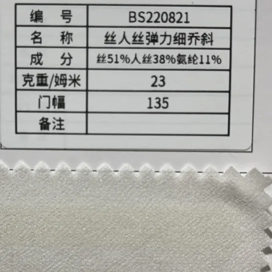 51% Silk/ 38% Rayon/ 11% Spandex Elastic Silk Fabric 23 Momme (98.9GSM) 135cms Features: