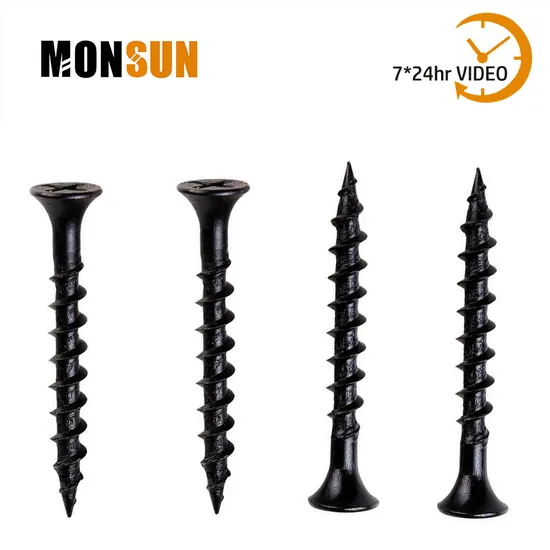 Coarse threaded drywall screw with a bugle head, spaced threads, a particularly sharp point, and a black phosphate finish. Drywall screws are a very common screw, The head type is commonly known as the bugle head (DW). However, there are also truss head and washer head.Drywall screws refer to Standards, JIS B 1125, GB/T 14210-93C and customer specified standards.