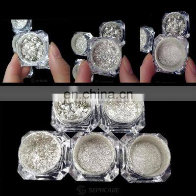 Product DescriptionSephcare Hot seling super shine mirror silver nail polish powderMirror pigment: A pigment powder is made by the hologram effect reflecting the rainbow-shaped light and changes color depending on the angle with light. Holography occurs when light waves are recorded at different angles, resulting in a three-dimensional image being reflected from a two-dimensional surface.Holographic pigments work much better than traditional metallic pigments. Holographic pigments disperse better in the resins and provide a brighter more reflective surface than traditional aluminum metal flake pigments. The holographic pearlescent pigments provide a vibrant color changing effect as light strikes the surface of cured resins.Item Name Mirror Silver PowderColorSilverParticle Size15μm 25μm 35μm 38μm FormPowderMOQ100 GramsPaymentTT/Paypal/Wester UnionShipping By Fedex/DHL, Air, SeaDetailed ImagesOur CompanyOur ServiceTo support all the demanding customers, we are going to focus on value addition in order to satisfy the needs of all our customers. The valued-added service spans:1.Special Packings 2.Own Brand Labeled 3.Product Images Support 4.Formulation Guideline Support,etcPacking & DeliveryAll freights are determined based on the weight of the item and the destination. 1.1kg with double plastic container inside/Aluminum foil bag outside. 25kg with double plastic container inside/Fiber drum outside or it is at your option.2.Dispatch goods Usually via DHL and FEDEX, but other kind of shipping ways can be negotiated.3.Delivery Time: 7 days after payment.FAQQ1: How can I place order?A: You can send inquiry to us or start a chat online with me first.Q2: Do you provide samples?A: Yes. Sample pack can be send to you, please tell us your usages, also need your shipping address and post code.Q3:How can I pay for you?A: We accept Online bank payment,T/T and Western Union and Trade Assurance. Before you pay, please contact us for payment details.Q4: Can you do OEM for me?A: Yes, we are good at OEM order, just provide us what you want and we can give the best design.